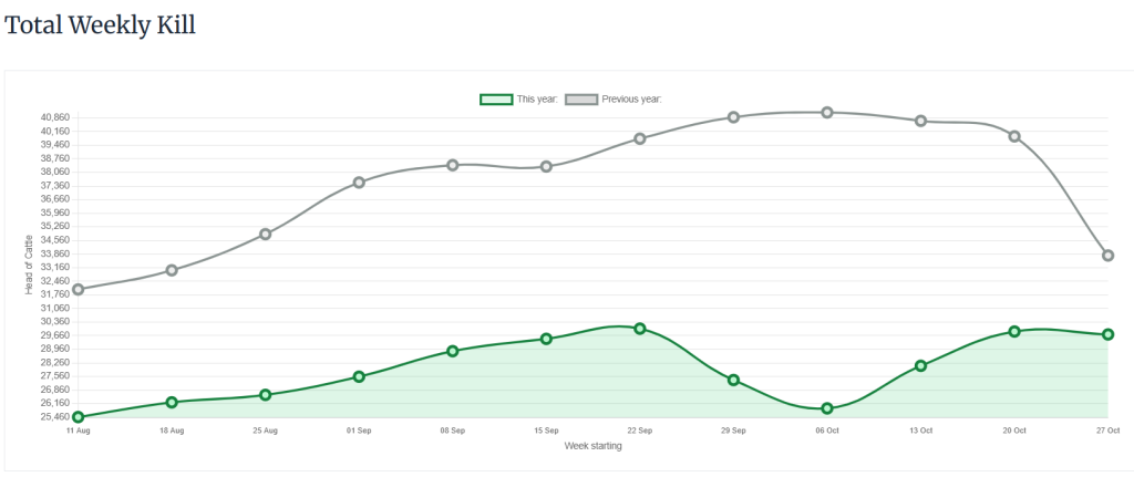 The table below details cattle supplies in the week ending Sunday, October 26, compared to the same week of last year, and the cumulative kill-to-date this year compared to last year: