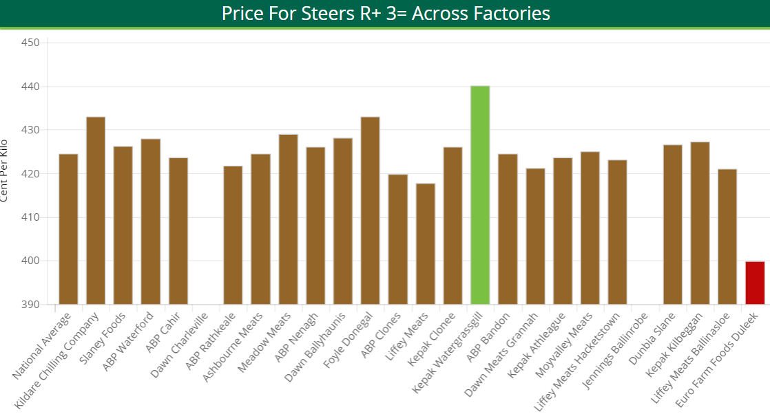 Furthermore, a top price of 440.05c/kg was achieved for R+3= steers; the average price paid for these animals stood at 424.55c/kg.