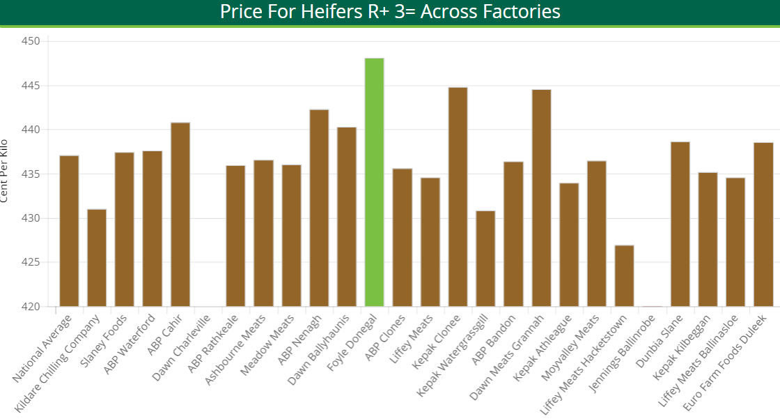 During the week ending April 29, in-spec, R+3= heifers made a top price of 448.06c/kg, while the average price paid stood at 437.09c/kg.