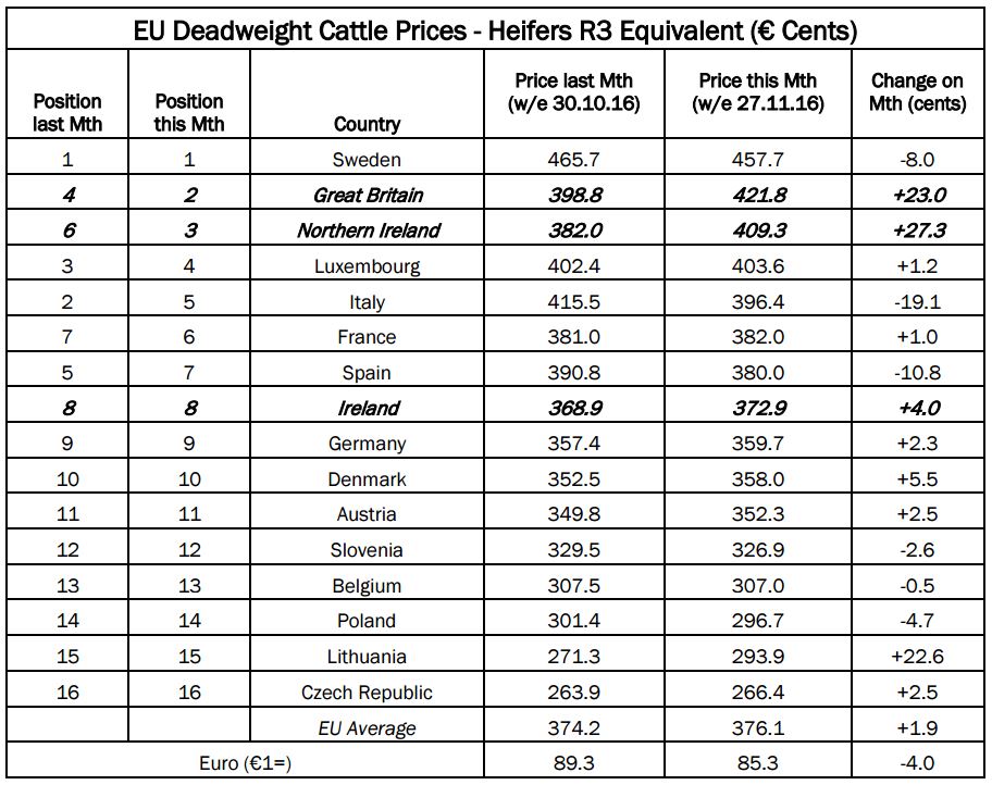 The Republic of Ireland remains in eight position in the EU league table for R3 grade heifer prices.