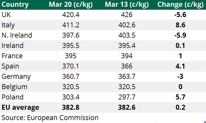 But, UK heifer prices have dropped in recent weeks, falling 5.6c/kg between March 20 and March 13 to stand at 420.4c/kg.