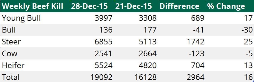 The weekly beef kill for the week commencing December 28, 2015, sits at 19,092 head. This is up 16% on the previous week, figures from the Department of Agriculture show.