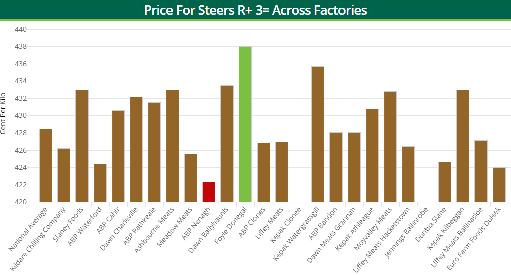 Furthermore, a top price of 438.04c/kg was achieved for R+3= steers; the average price paid for these animals stood at 428.45c/kg.