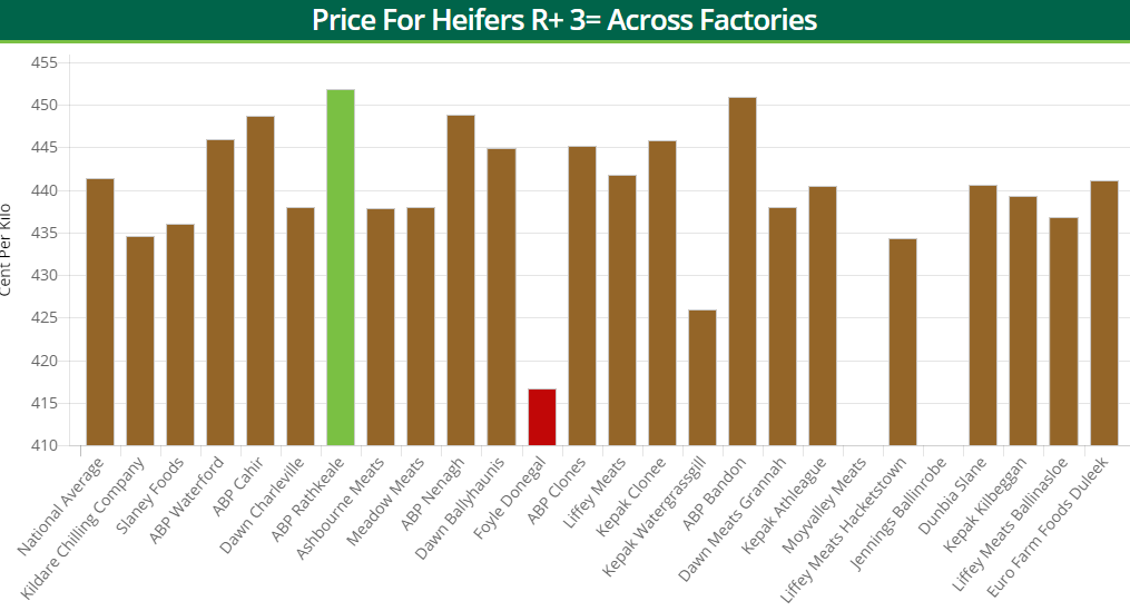 During the week ending May 13, in-spec, R+3= heifers made a top price of 451.85c/kg, while the average price paid stood at 441.42c/kg.