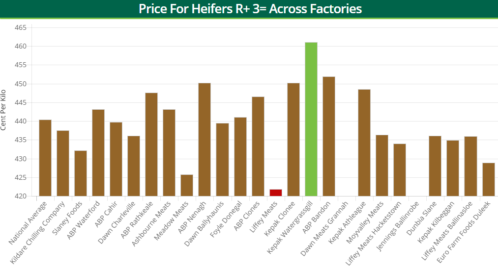 During the week ending July 1, in-spec, R+3= heifers made a top price of 461.02c/kg, while the average price paid stood at 440.36c/kg.