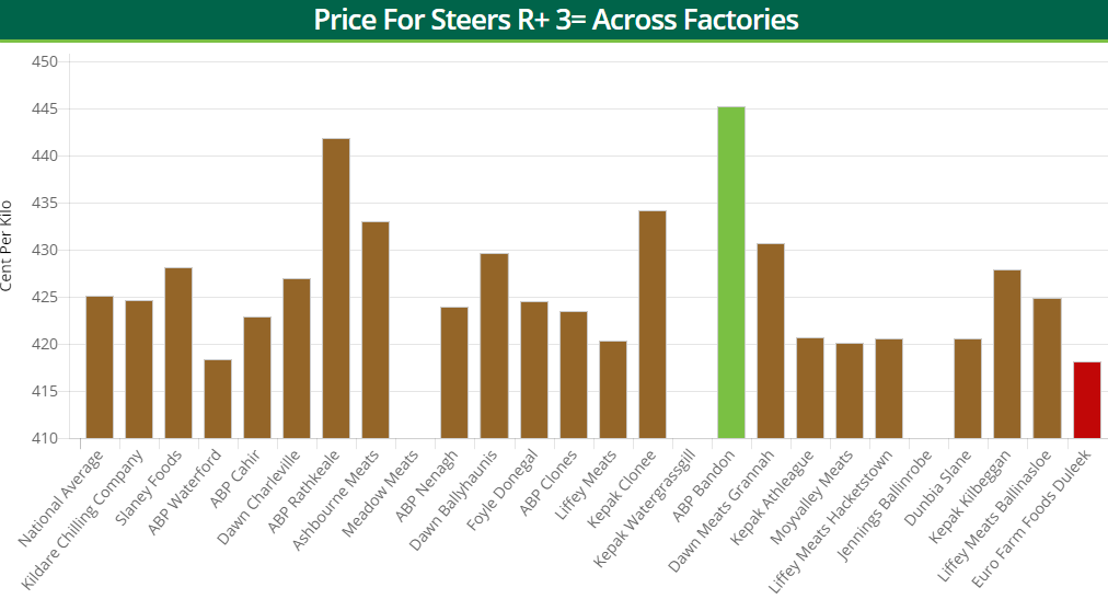 Furthermore, a top price of 445.21c/kg was achieved for R+3= steers; the average price paid for these animals stood at 425.08c/kg.