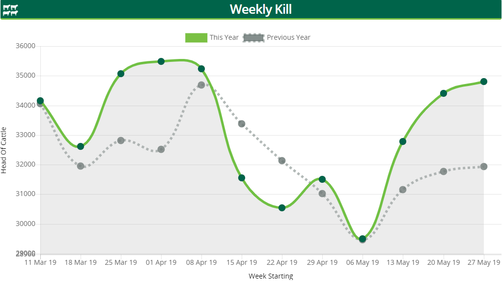 The number of steers slaughtered during the week ending June 2 stood at 10,125 head – a 613 head drop on the previous week’s kill.
