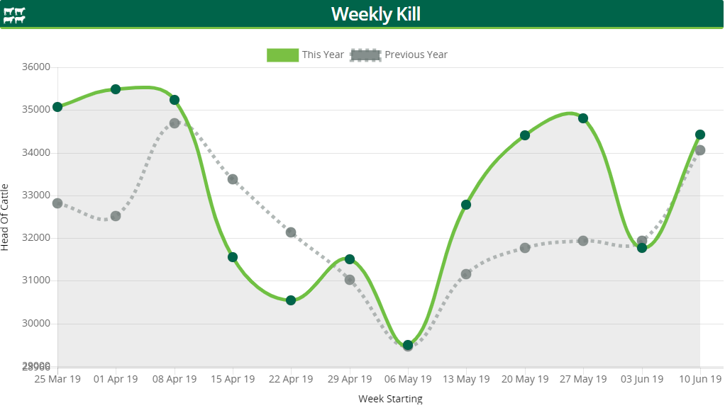 The latest kill figures from the department of agriculture’s beef kill database indicate that just over 34,600 cattle were slaughtered during the week ending June 23 – a slight increase from the previous week’s kill.