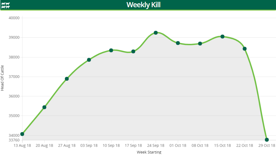 Official figures show that some 33,831 cattle were processed in Department of Agriculture approved beef export plants during the week ending November 4 – a fall of 4,622 when compared to the previous week’s kill. This was mainly due to the bank holiday Monday.