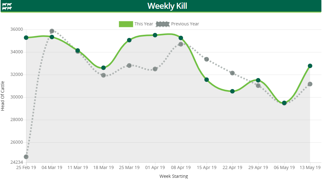 As mentioned above, figures from the department of agriculture’s beef kill database show that some 32,853 cattle have been slaughtered during the week ending May 19 – an increase of 3,156 head on the week before.