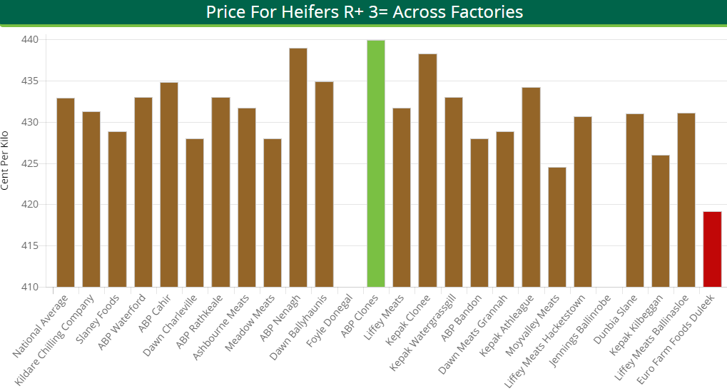 Furthermore, a top price of 439.94c/kg was achieved for R+3= heifers; the average price paid for these animals stood at 432.88c/kg.
