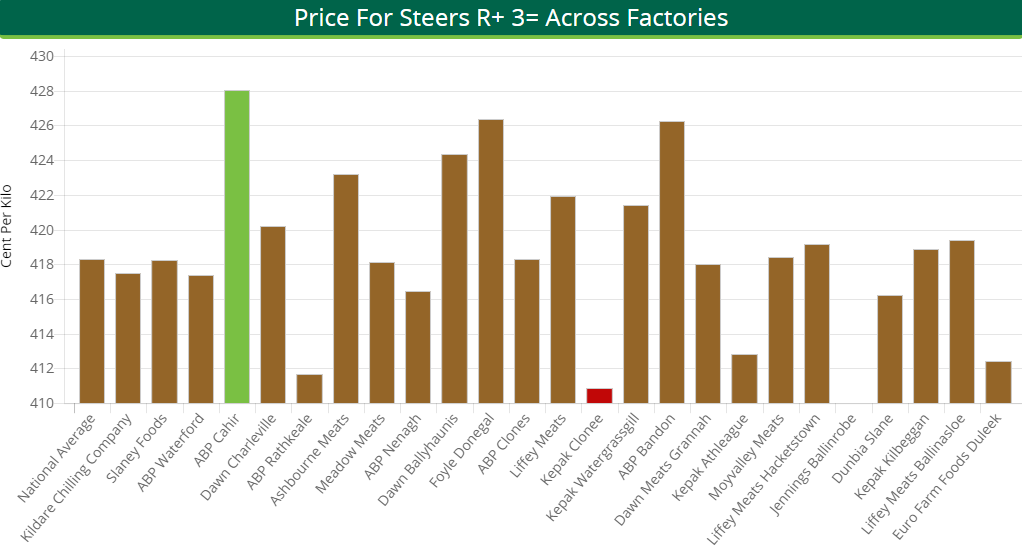 During the week ending April 15, in-spec, R+3= steers made a top price of 428.03c/kg, while the average price paid stood at 418.33c/kg.