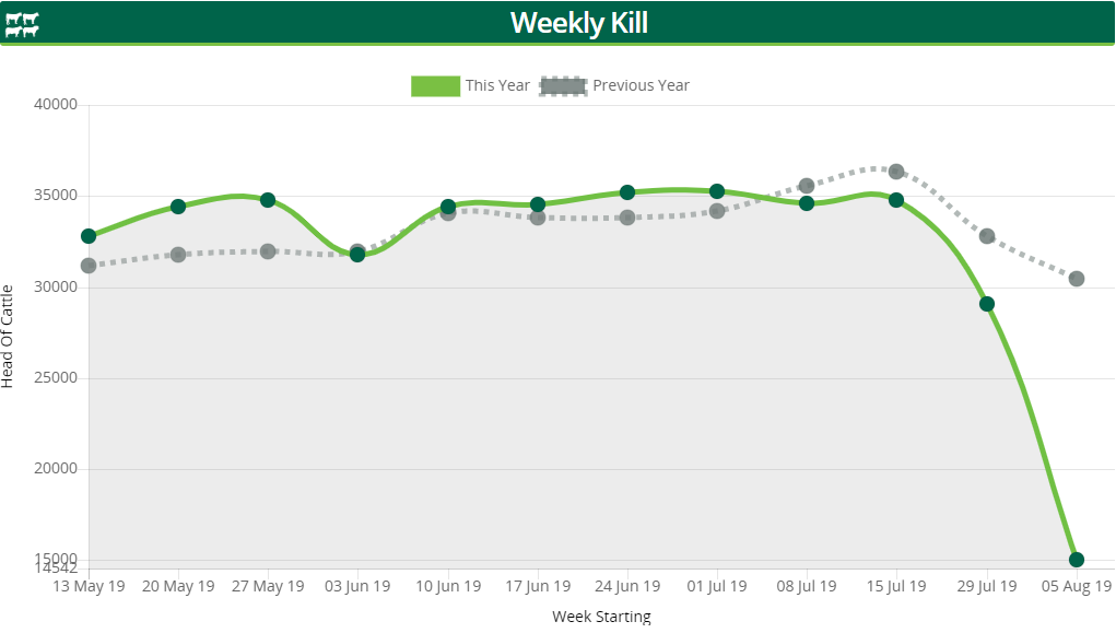 The latest data from the Department of Agriculture’s beef kill database shows that some 15,065 head of cattle were slaughtered during the week ending August 11 – a fall of 14,073 head or just over 48% when compared to the previous week.