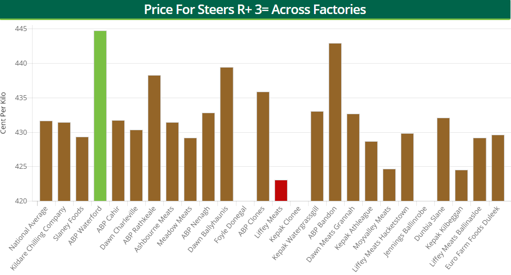 Furthermore, a top price of 444.68c/kg was achieved for R+3= steers; the average price paid for these animals stood at 431.61c/kg.