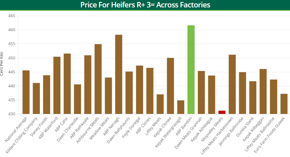 During the week ending June 24, in-spec, R+3= heifers made a top price of 461.65c/kg, while the average price paid stood at 445.53c/kg.