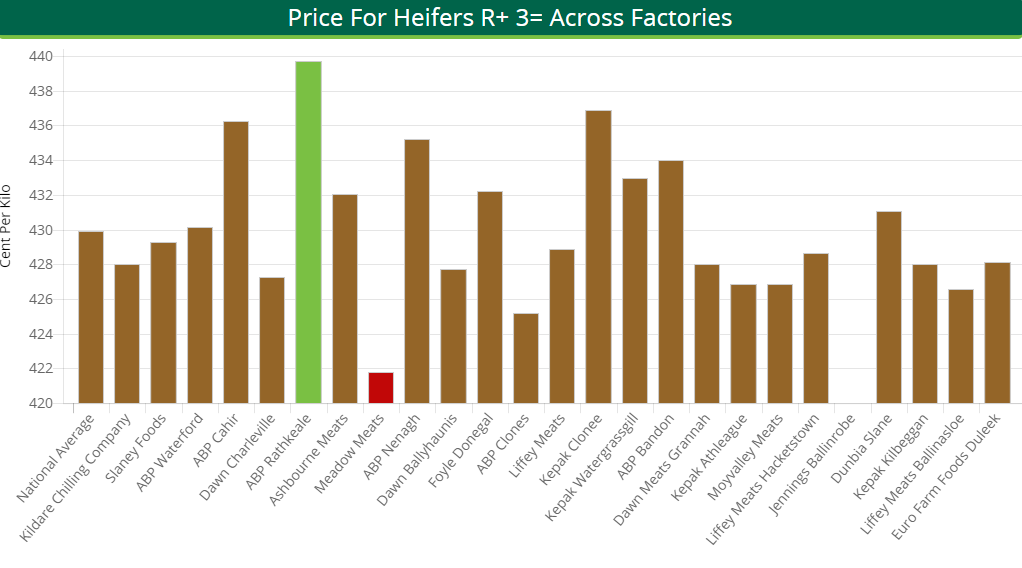 During the week ending January 14, in-spec, R+3= heifers made a top price of 439.73c/kg, while the average price paid stood at 429.93c/kg.