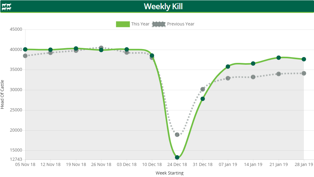 Looking at the latest data available, we can see that 37,700 head of cattle were slaughtered in beef plants during the week ending February 3. Even though this is a fall of 349 head on the previous week’s kill, it is still high given the time of year.