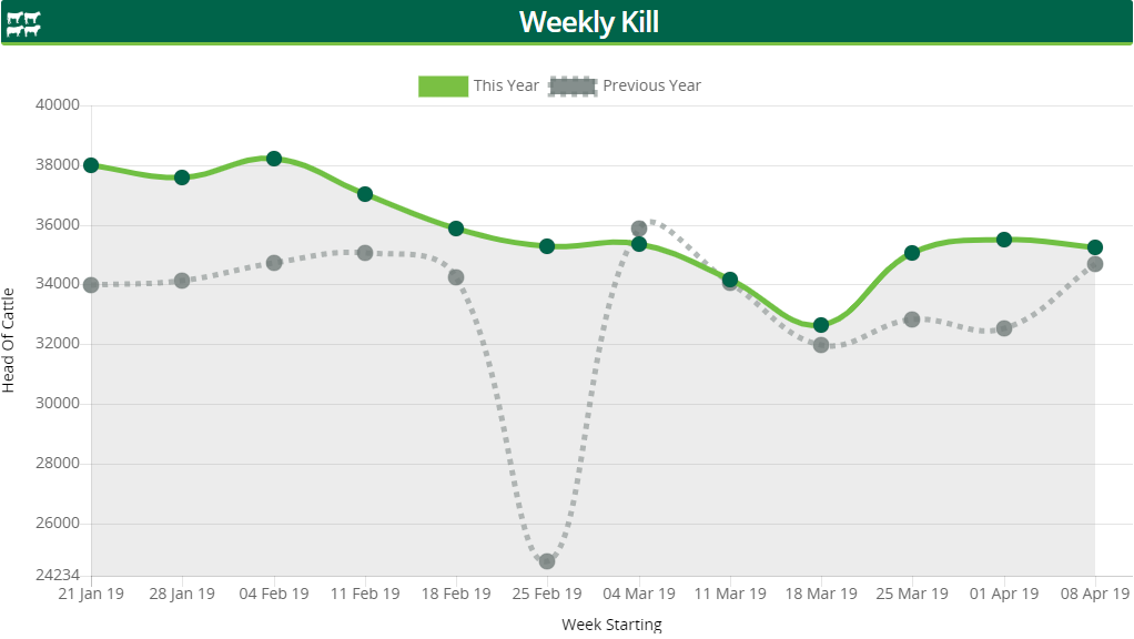 Turning to the weekly kill, as mentioned above, the total number of 35,245 cattle – excluding calves – were processed during the week ending April 14.