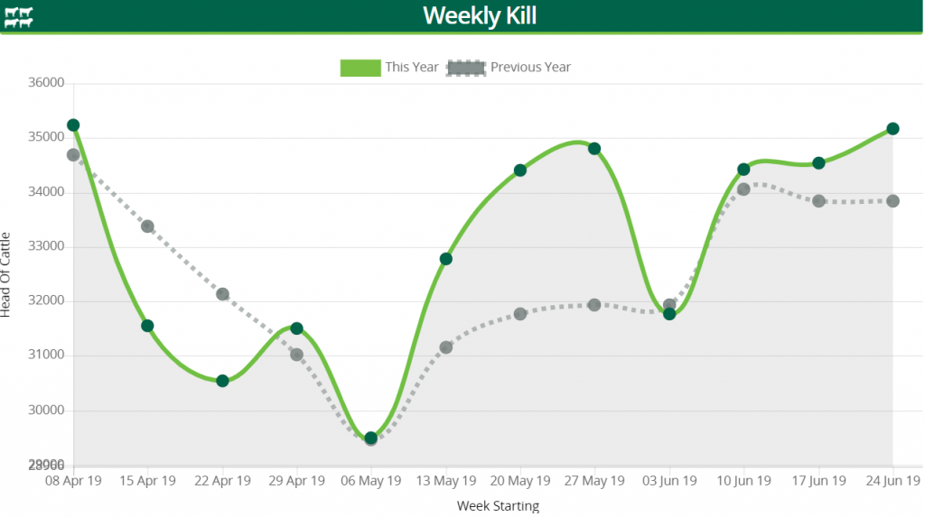 Figures from the Department of Agriculture, Food and the Marine show that the total kill for the week ending June 30 stood at 35,218 head – a jump of 612 head on the previous week’s total.