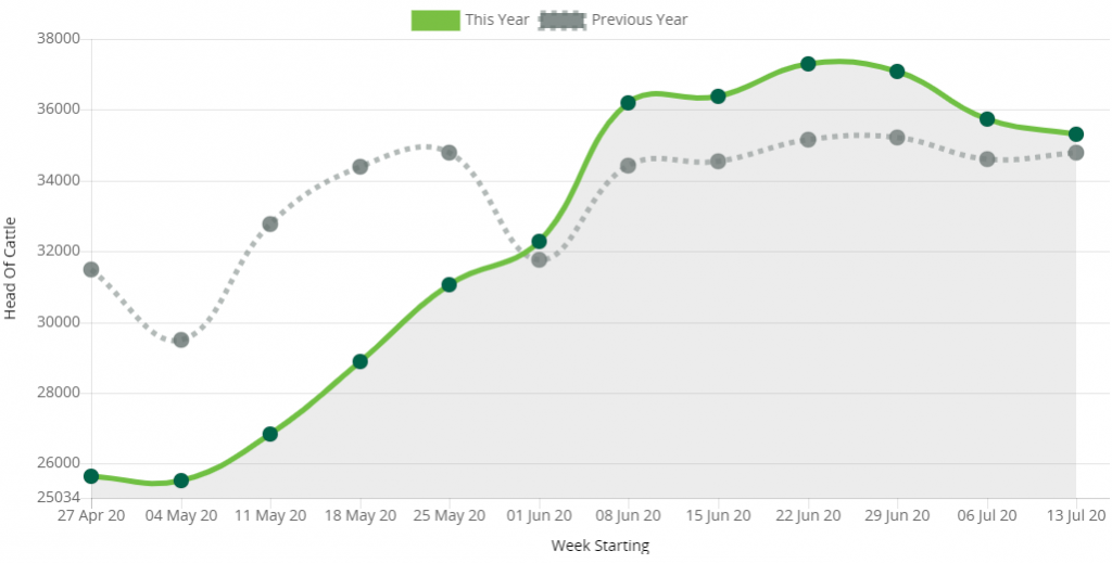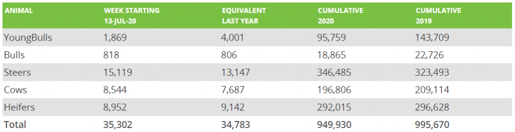 It should be noted that the number of young bulls slaughtered during the week ending July 19 was 2,132 head lower in comparison to the same week in 2019, when 4,001 young bulls were processed – this represents the farmers’ switch to steer production systems.