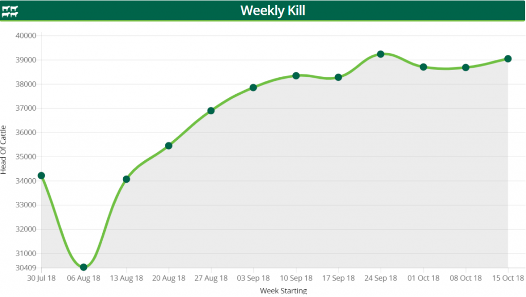 The addition of last week’s throughput brings the cumulative kill for the year, up to and including the week ending October 21, to over 1.44 million head – an extra 51,429 head when compared to the same period in 2017.