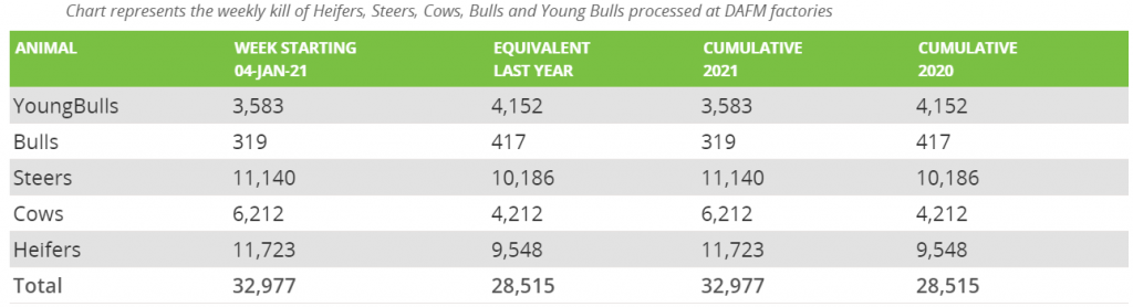 The official kill for the first week of 2021 recorded a total of 32,977 head of cattle being processed. This figure is up 4,462 head from the cumulative period for 2020.