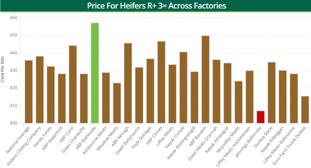 During the week ending July 8, in-spec, R+3= heifers made a top price of 457.01c/kg, while the average price paid stood at 435.72c/kg.