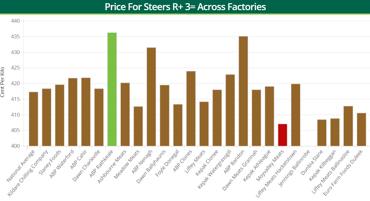 Furthermore, a top price of 436.25c/kg was achieved for R+3= steers; the average price paid for these animals stood at 417.28c/kg.