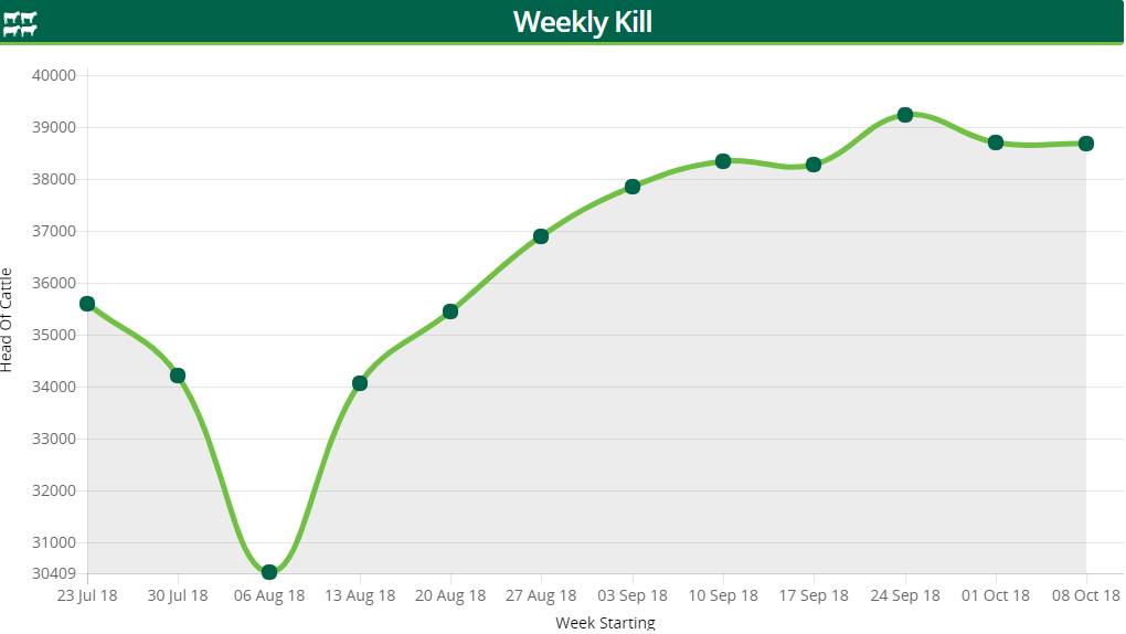 Finally, looking at heifer throughput, slaughterings of these animals are up 21,732 when compared to 2017 figures. Up to and including the week ending October 14, some 376,872 heifers have been slaughtered.