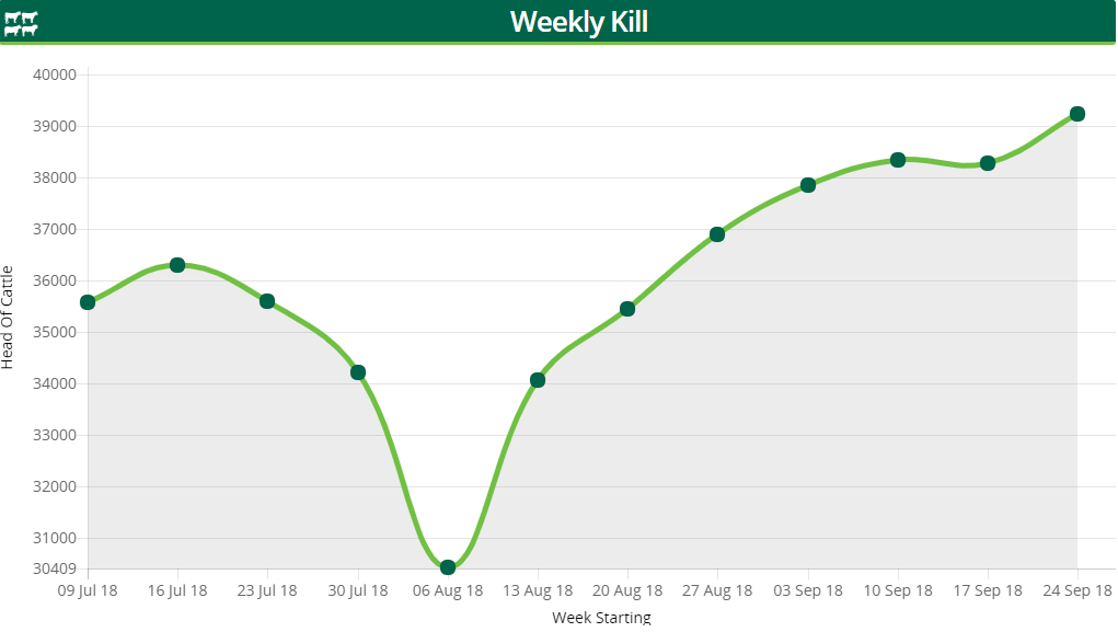 Official figures show that some 39,255 cattle were processed in Department of Agriculture approved beef export plants last week – the highest weekly kill since the week ending December 10, 2017.