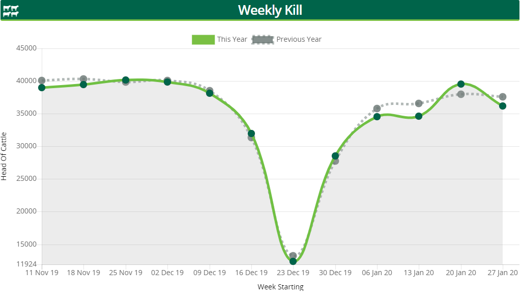 Figures released by the Department of Agriculture, Food and the Marine show that there were some 36,234 cattle processed in beef plants during the week ending February 2, 2020.