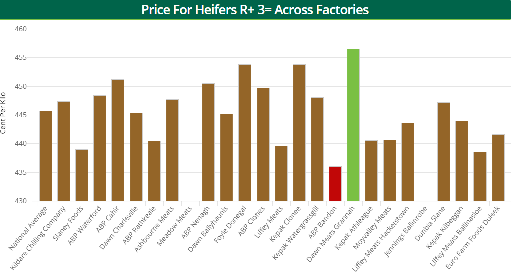 During the week ending May 13, in-spec, R+3= heifers made a top price of 456.49c/kg, while the average price paid stood at 445.74c/kg.