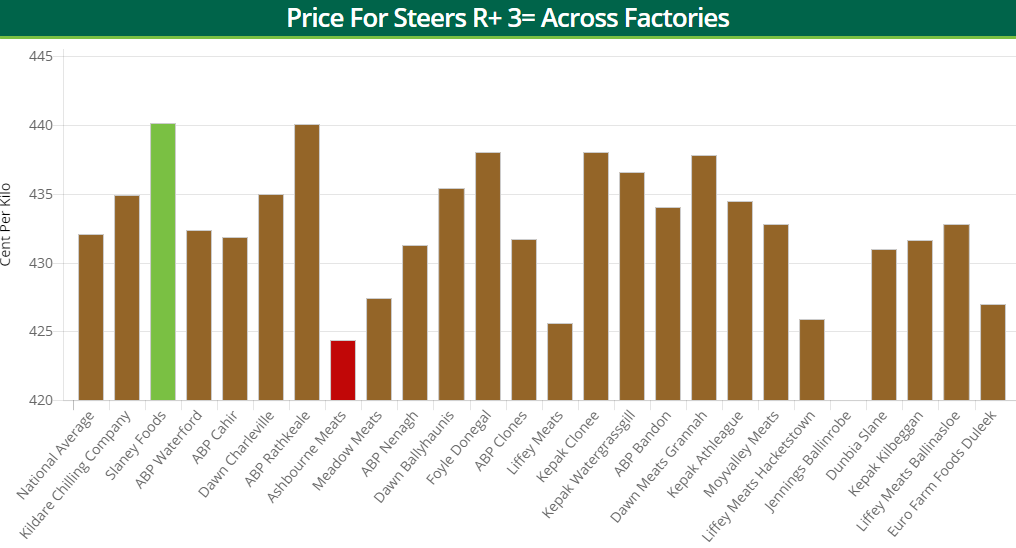 Furthermore, a top price of 440.15c/kg was achieved for R+3= steers; the average price paid for these animals stood at 432.04c/kg.
