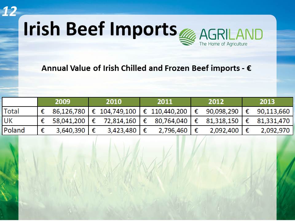 International Trade Centre figures show direct imports of Polish beef into Ireland have been in decline since 2009. Polish beef imports accounted for 2.3% of Irish beef imports in 2013. Some 90% of Irish beef imports are imported via the UK. The value of these imports has increased by 40% since 2009. In 2013, total beef imports were worth €90.1m.