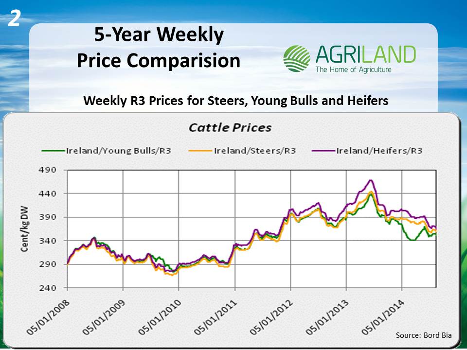Over the past year Irish prices have dropped overall by 10%. However, when compared over a five-year period, the average 2014 R3 Steer and Heifer prices have dropped below the 2012 annual average, and the 2014 R3 Young Bull average is approaching the overall 2011 average price. It is only since 2013 that price differences have become more noticeable between young bulls, heifers and steers.