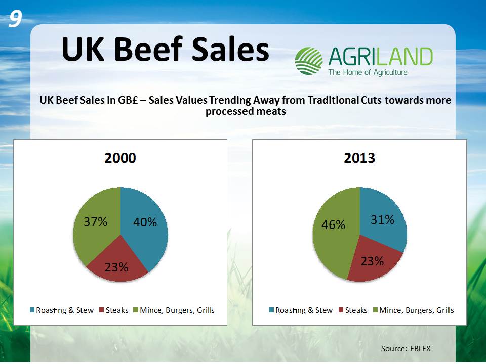 Independent analysis, by Kantar Media, notes that British beef sales are up by 4.4% over the past year to nearly €2.7 billion. Even though UK beef sales have posted an increase over the past 12 months, concerns arise when you drill down through where these gains are being made. Judging from the sales volumes, it is evident that British consumer trends are veering away from the traditional Sunday roasts and stews towards lower value processed meats such as mince, and burgers.