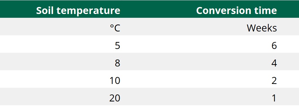 The reaction time for urea to be converted to ammonium depends on temperature and soil conditions, but typically reaction will begin to occur around 24 hours after initial application and will be complete within three-to-seven days – but this reaction time is slowest in cooler, waterlogged soils.