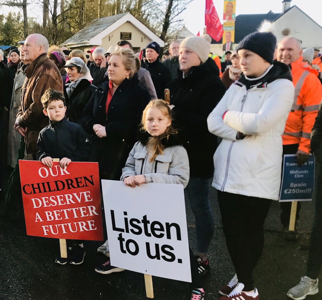 Speaking at the protest – that took place outside ESB’s peat-fired West Offaly Power Plant in Shannonbridge, Co. Offaly, on Saturday, February 1 – independent TD Michael Fitzmaurice compared the timeline of the Irish Government’s ‘just transition’ away from fossil fuel-derived power, to that of Germany’s plan to phase out coal-fired power stations over the next 19 years.