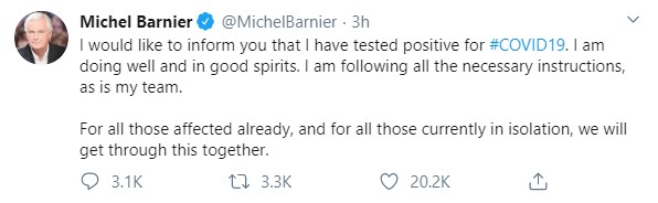 Through his Twitter account, Barnier said: “I would like to inform you that I have tested positive for Covid-19.