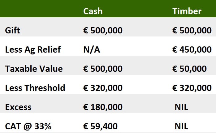 For example, if a child was to inherit €500,000 cash with no previous benefits, then a CAT liability of €90,750 arises. However, if a child inherits €500,000 worth of timber growing on lands, then the value of same is reduced for tax purposes – no charge to CAT arises.