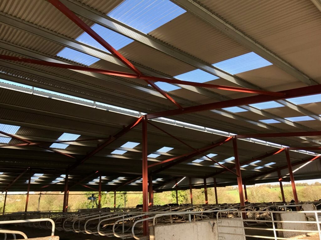 The shed is 20ft high at the apex. It is wider (112ft) than it is long (100ft). Cattle can be fed on three sides of the shed.