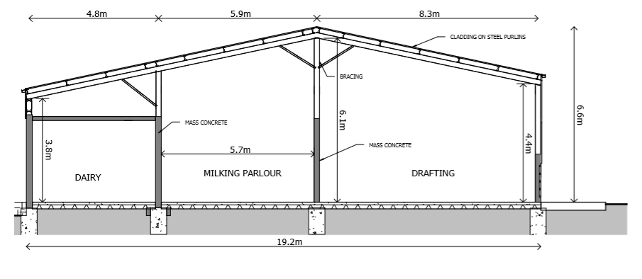 The building is 24.1m long and 19.2m wide. The unit stands at 6.6m high at the apex and 3.8m high to the eave gutters. The concrete walls of the shed stand at 2.4m high.