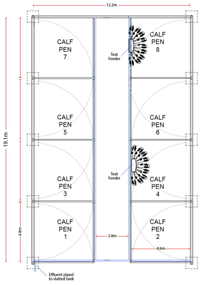 The unit contains eight separate pens, which are 4.8m long and 4.6m wide. The centre passage is 2.8m wide.