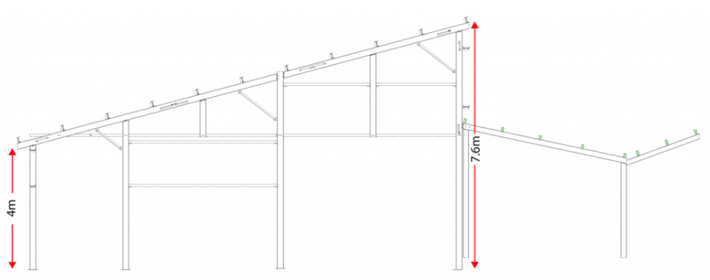 The shed itself is 28.5m long and 21.6m wide. It is 4m high to the eve gutters and 7.6m high to the apex. An additional two bays – measuring 3.6m and 3.5m in width – were added on to the existing unit; these bays are 5.1m long.