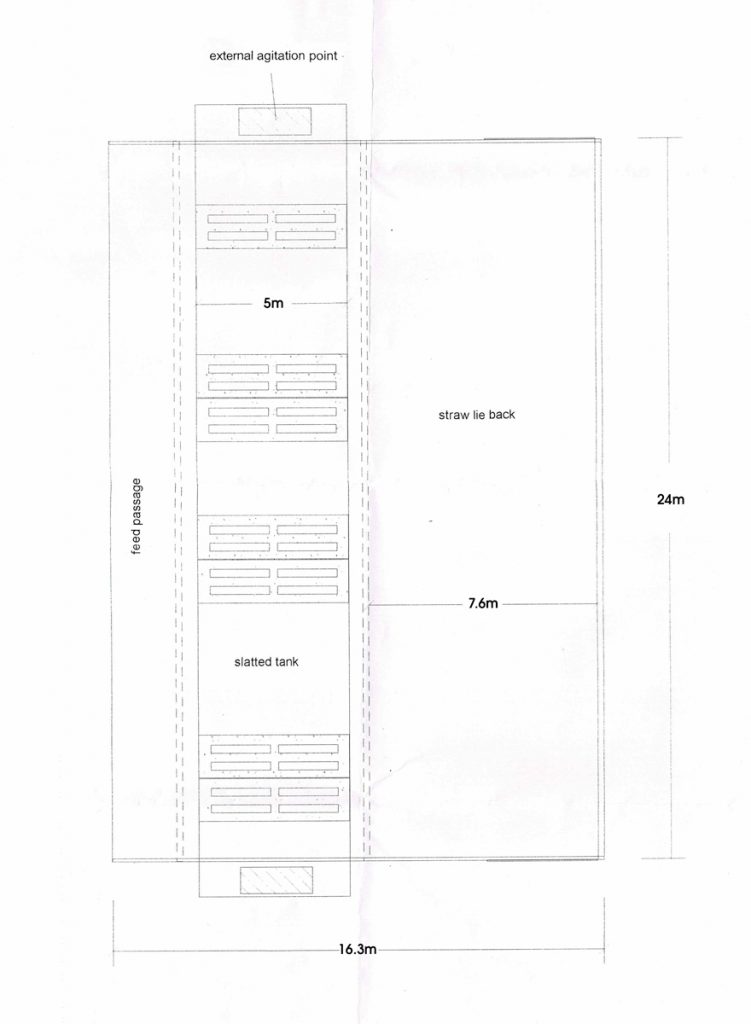 The bays of the shed measure 4.8m in width. The slatted area is 5m wide; calves have access to a solid lie-back area via creep gates. This section is bedded with straw and measures 7.6m in width.