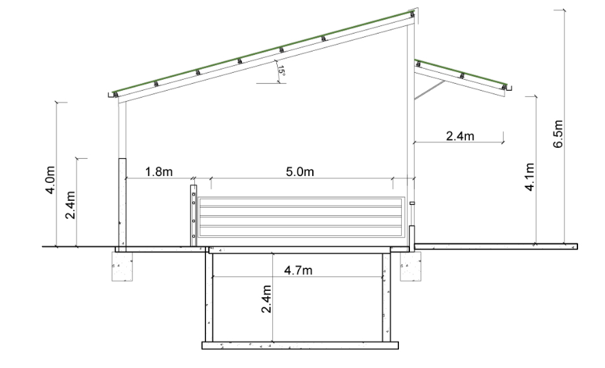 The building is 24m long including the outer feed passageway. The unit stands 6.5m high at the apex and 4.0m to the eave gutters.