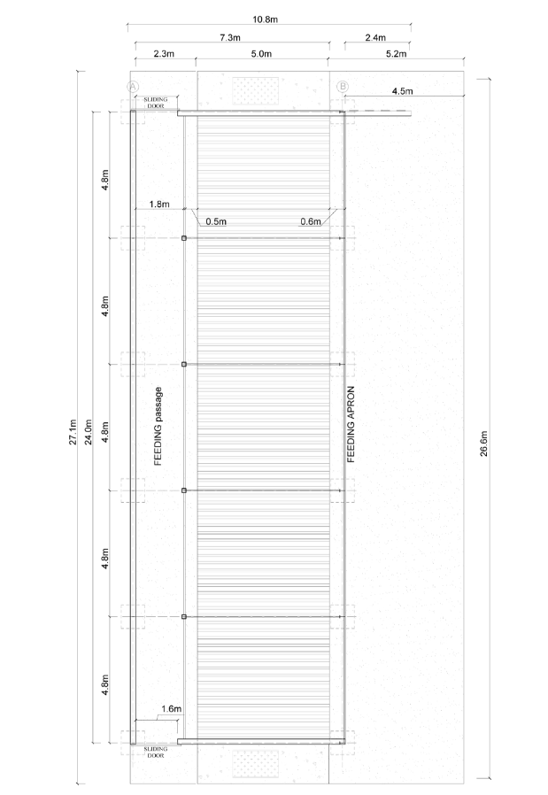 The five slatted pens are 4.8m long and 5.0m wide. The outer feeding passageway is 4.5m wide. A roof overhang is incorporated into the design just over the outer feed passageway. The inside feeding passageway is 1.8m wide.