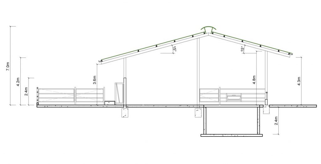 The four-bay shed is 7.0m high at the apex. It is 19.2m long and 12.2m wide. The concrete walls of the shed stand at 2.4m. The shed is 4.3m high to the eve gutters at the front of the unit and 3.6m high at the rear.Large sliding doors are also located at either end of the unit. Four lay-back pens are positioned at the back of the slatted pens. The floors are sloped in the pens back to the slatted area – which keeps the straw beds dry – and measure 6.4m long and 4.8m wide.