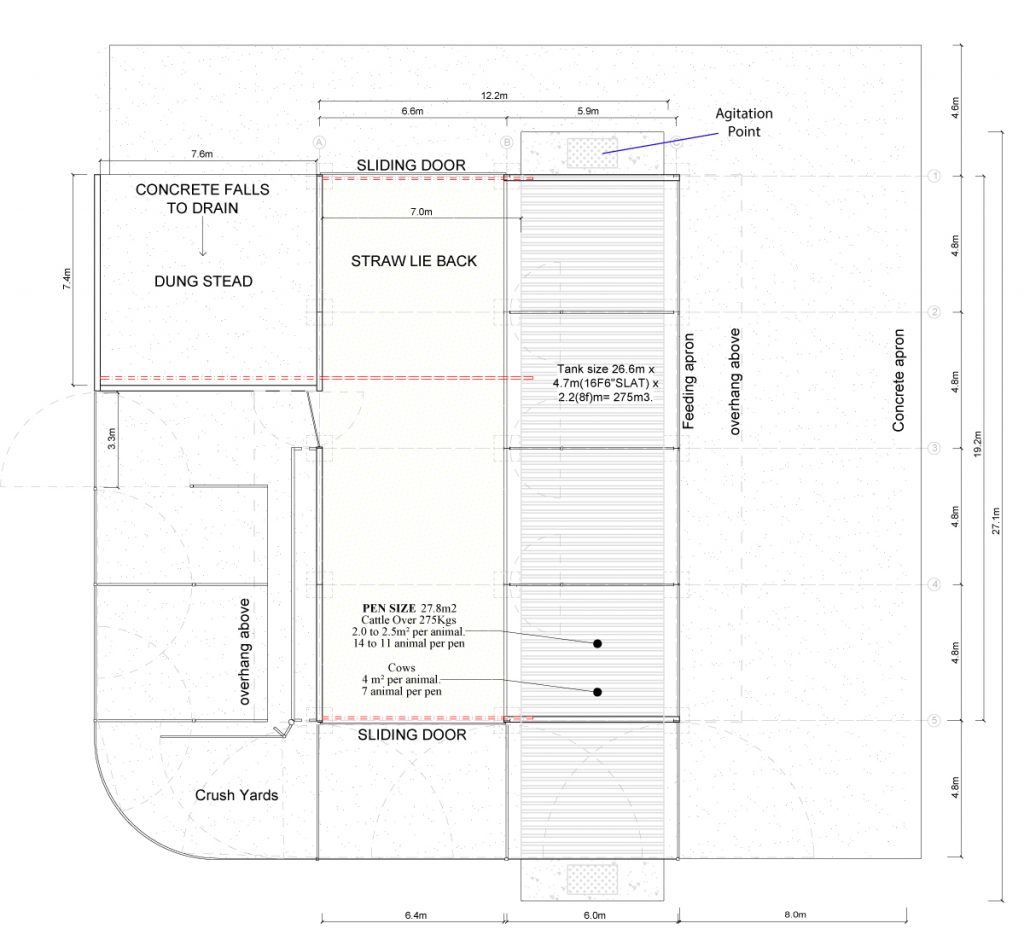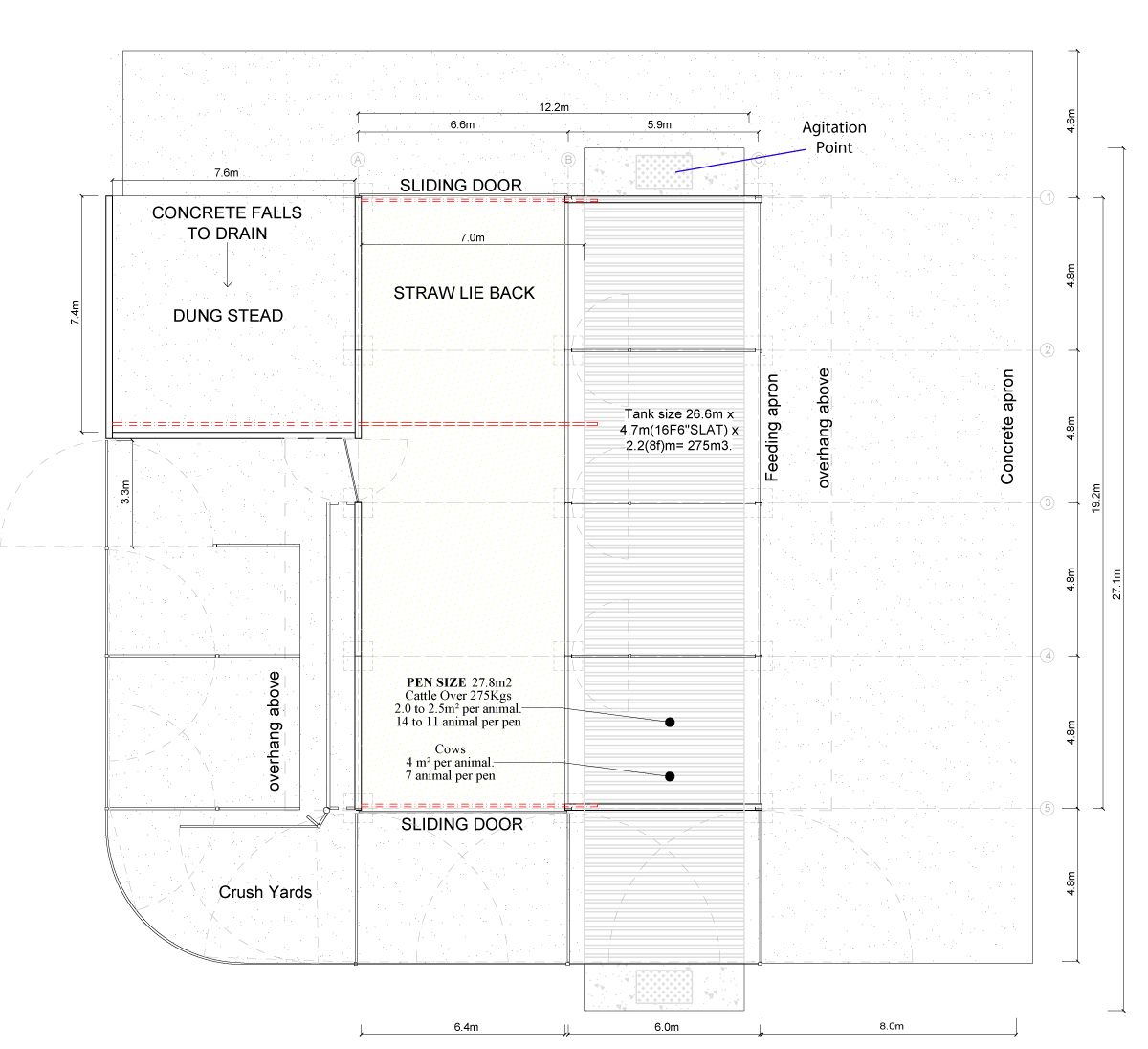The four slatted pens are 4.8m long and 6.4m wide; however, the tank is spread over five spans. It is 27.1m long, 4.7m wide and 2.4m deep. Two agitation points are located at either end of the tank.