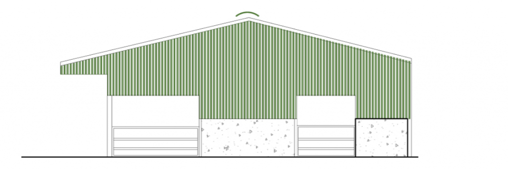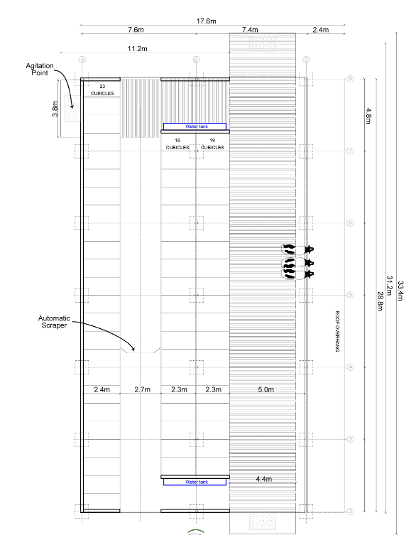 The cubicle shed is six bays long, with each span 4.8m in length. A roof overhang is incorporated into the design just over the feed passageway, to prevent rain getting into the shed and to keep the silage dry.